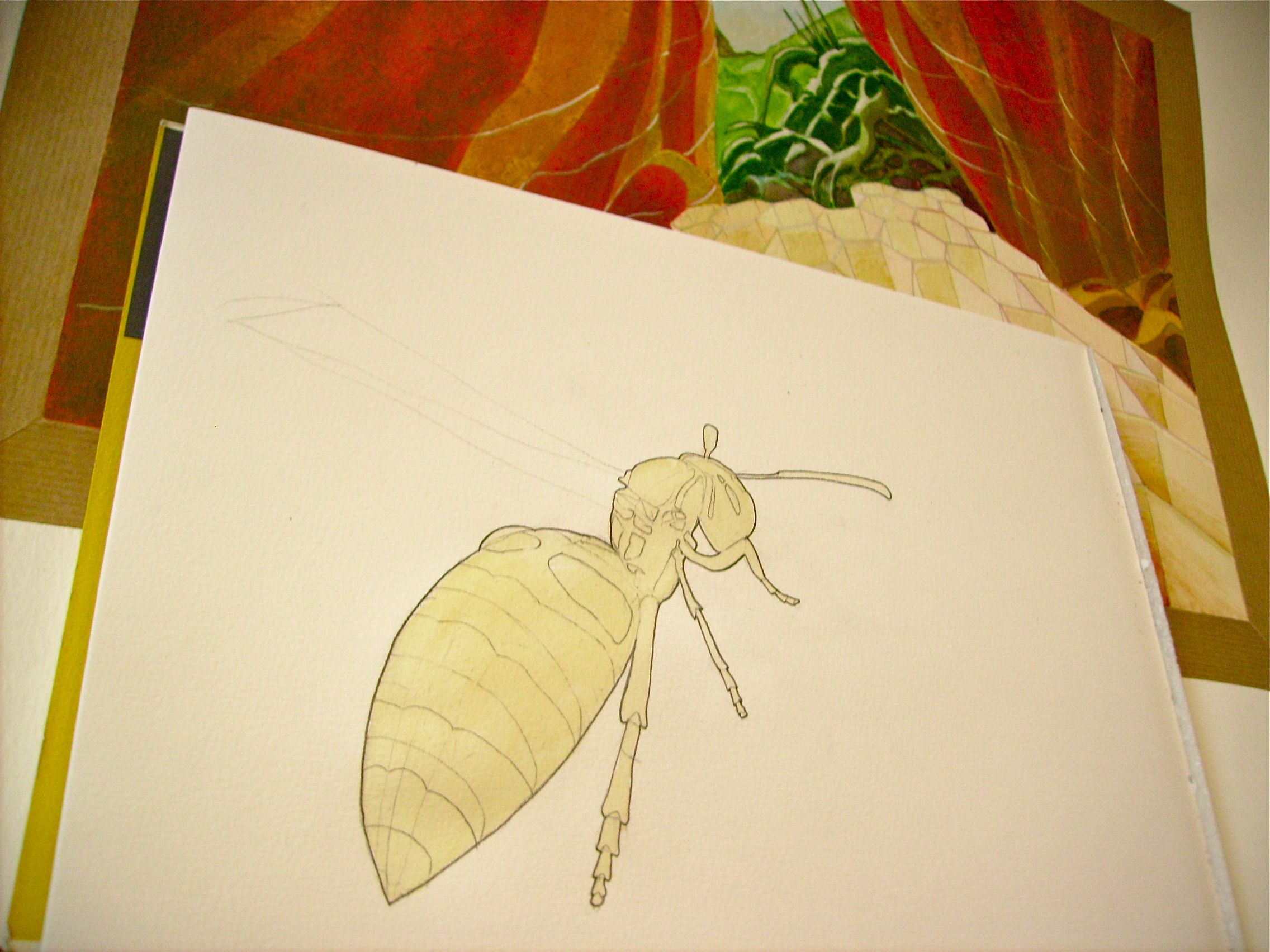 Aquarelles Dessin de guêpe sur décor acrylique 15 janvier 2010 Yann 4 commentaires premières étapes Début de la mise en couleur de la guêpe. Les couleurs sont montées progressivement pour approcher l’ambiance du décor par lavis successifs.